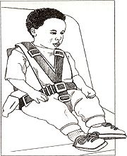 The five-point harness: This harness, which consists of a strap over each shoulder, a strap over each hip, and a strap at the crotch, is easily adjustable to fit snugly, and is considered by many safety experts the best protection for both infants and toddlers. The straps, however, tend to twist and tangle, so it is important to always be sure that they are lying flat.